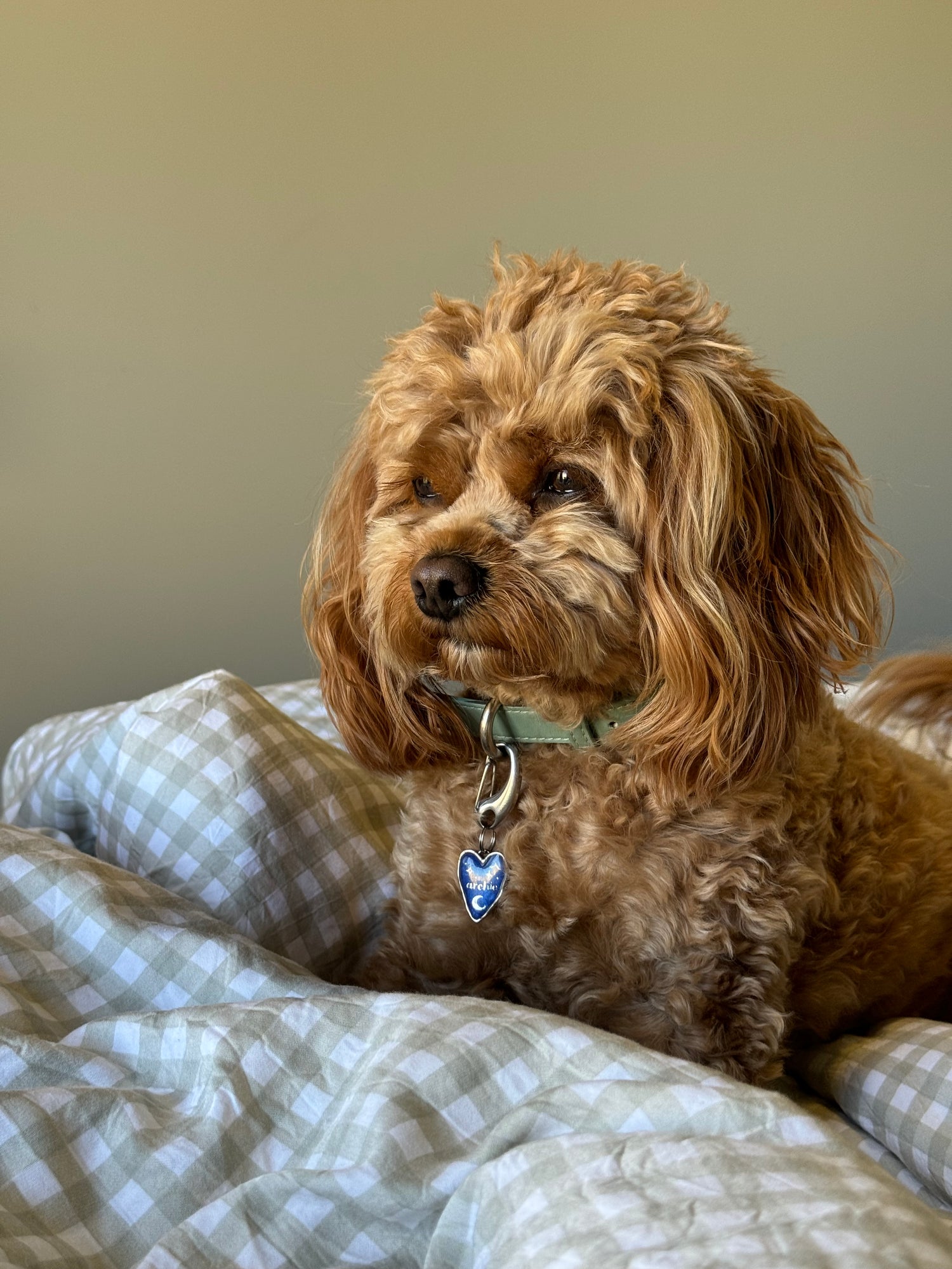 Model Dog: Archie in our blue 'Wonky Affections' resin tag with silver hardware.