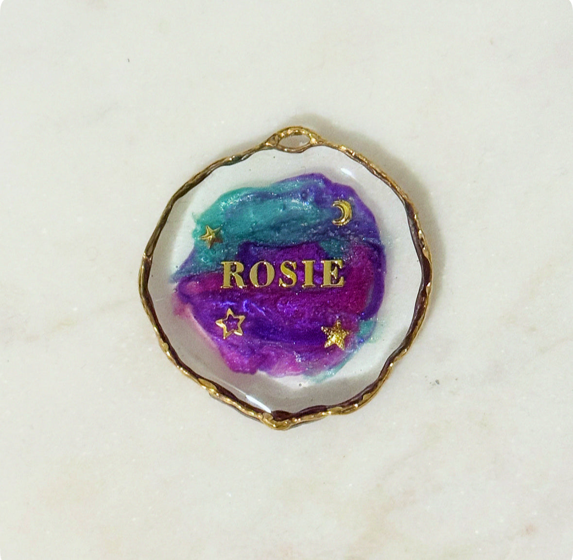 - Model tag: Wonky circle 35mm with a blend of pink, teal and purple metallic colours